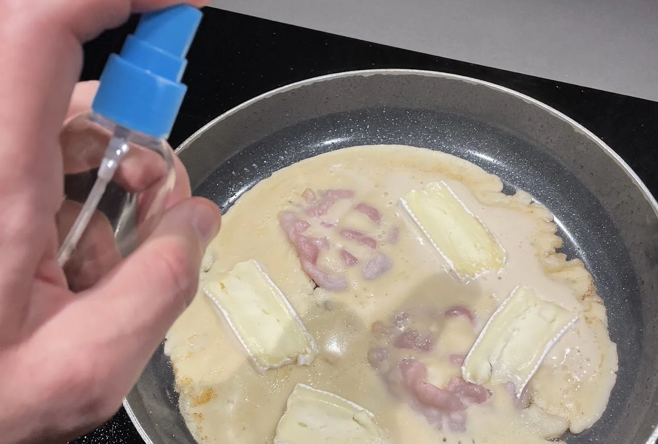 Spray the whisky royally over the pancake before you turn it, don't use too little, but if you see clear puddles of whisky forming on the batter, you might have used too much.