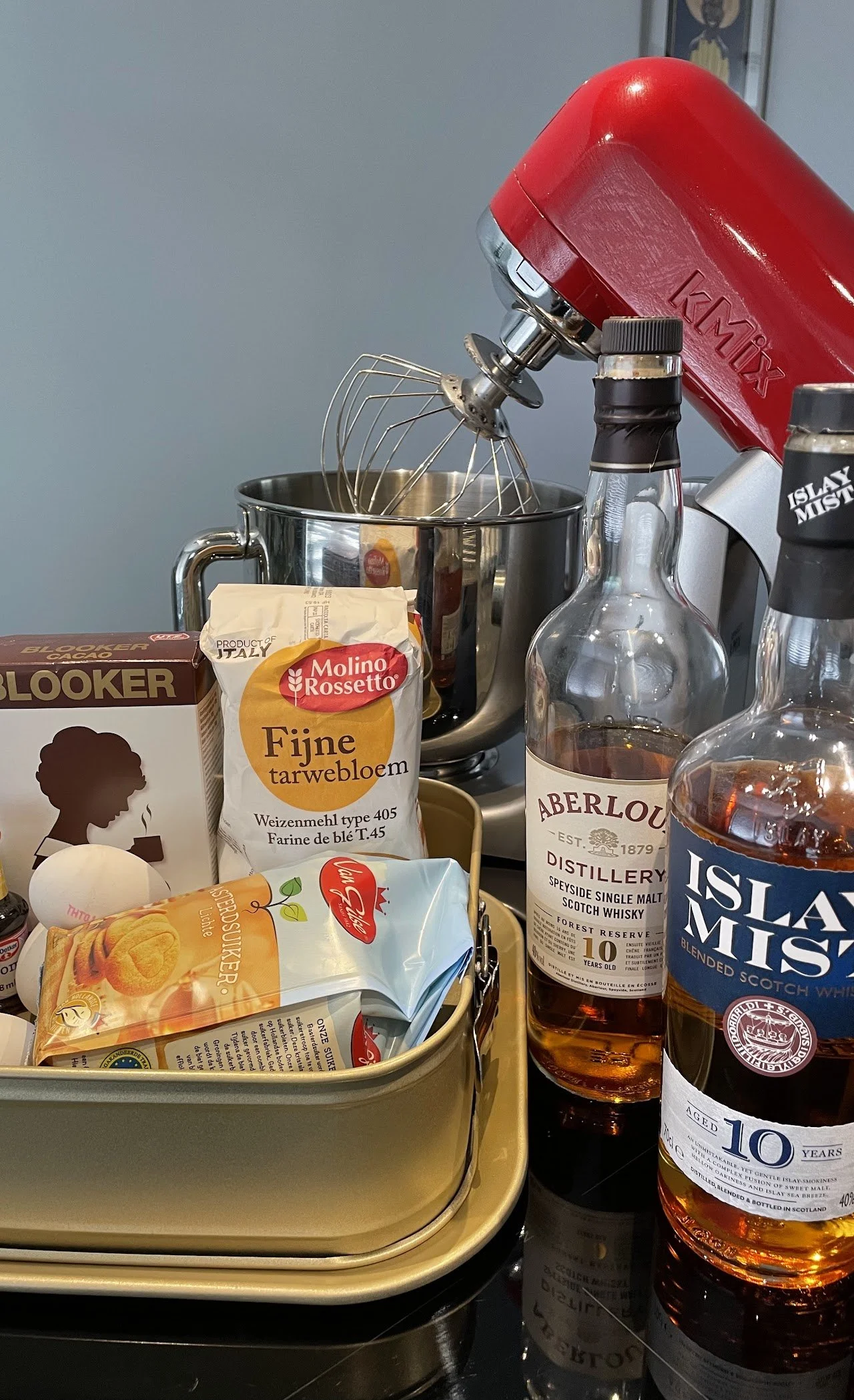 Put the flour, vanilla, eggs and the heated mix in a mixing bowl. Add your whisky. I used around 50 ml per batch.
