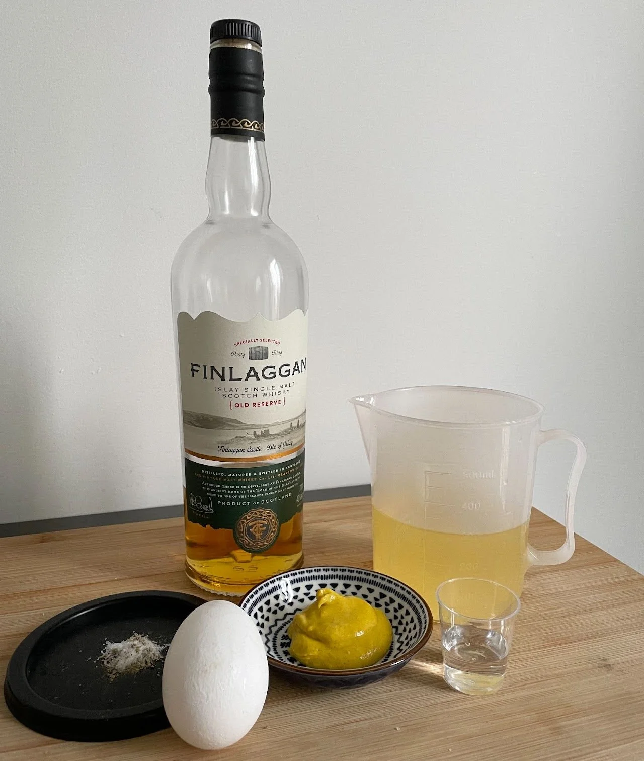 Warning: some experimenting has to be done to find the right whisky for your taste. Some flavors in the whisky react with the other ingredients and might taste stronger or disappear. In this recipe I used a Finlaggan Old Reserve. This is a peaty Islay single malt that will leave a very slight smoke flavor to the mayonnaise, but some bitters ass well.