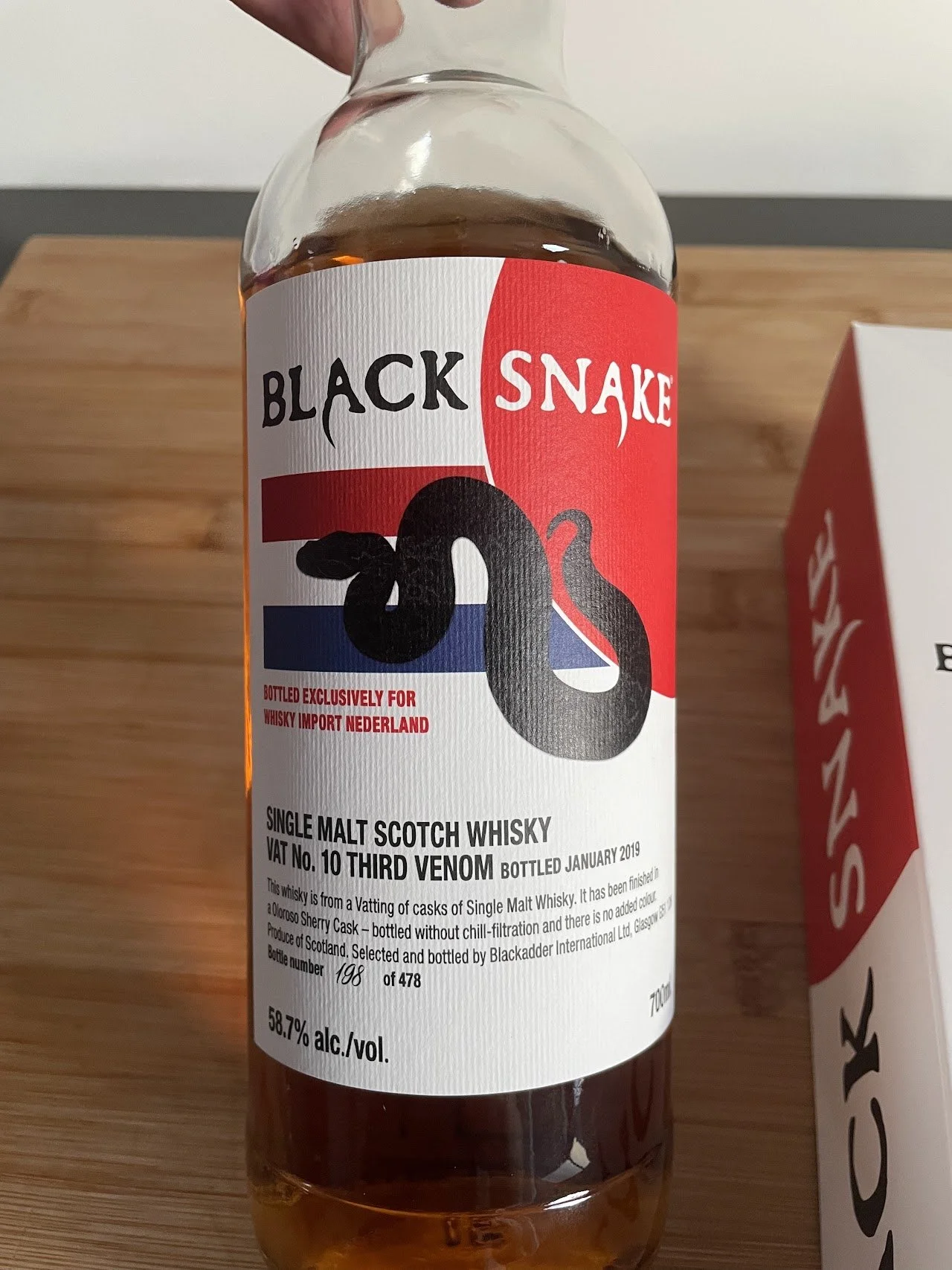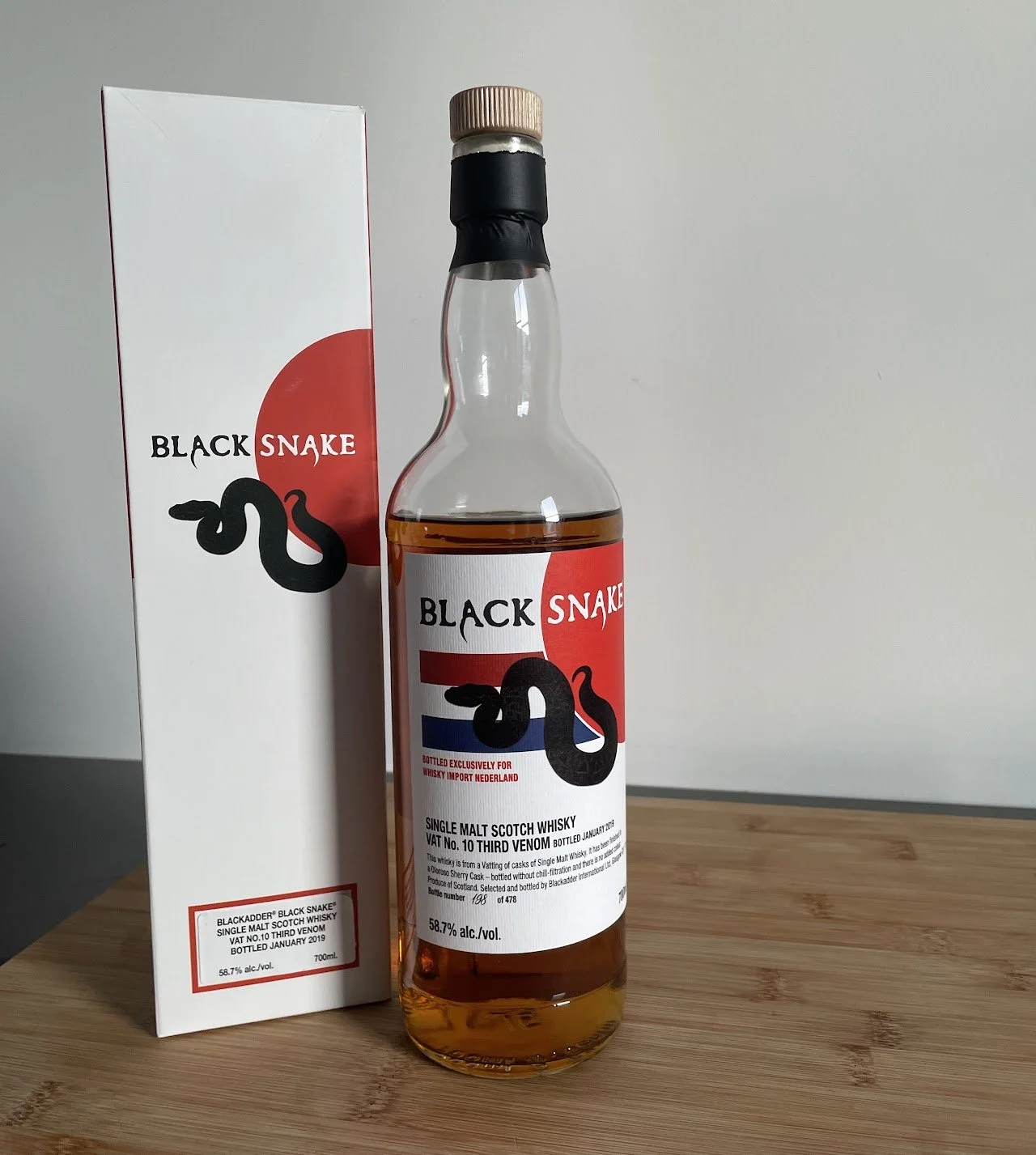 I had an easter holiday. Perfect time to open a new bottle. After playing rock-paper-scissors with myself to decide which bottle to open, the choice fell on this Black Snake from Blackadder independent bottling company.