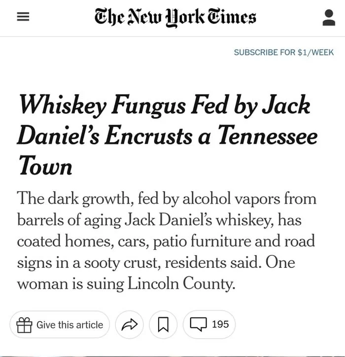 Panic in Tennessee this March. The locals of Lincoln County are complaining about a dark fungus, consuming and covering everything that is outside. It looks like a lawsuit will follow, which will halt the building of a 7th barrelhouse for the Jack Daniel's distillery.